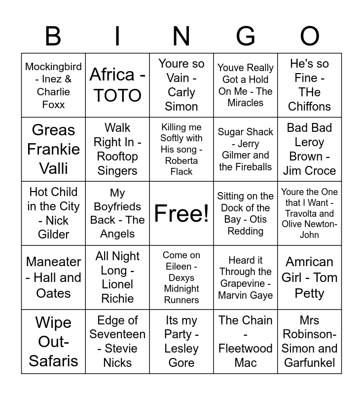 This bingo card has a free space and 57 words: Surfin USA- Beach Boys, Wipe Out- Safaris, Walk Like a Man- Four Seasons, Mockingbird - Inez & Charlie Foxx, Its my Party - Lesley Gore, Puff the Magic Dragon - Peter Paul and Mary, Walk Right In - Rooftop Singers, Be My Baby - The Ronettes, Sugar Shack - Jerry Gilmer and the Fireballs, Da Doo Ron Ron - The Crystals, Youve Really Got a Hold On Me - The Miracles, Ring of Fire - Johnny Cash, Just One Look - Doris Troy, Hello Muddah Hello Faddah - Allan Sherman, OH Whata Night December 63- Frankie Valli, Another Saturday Night - Sam Cooke, He's so Fine - THe Chiffons, My Boyfrieds Back - The Angels, Blame It on the Bossanova - Edie Gorme, Mrs Robinson- Simon and Garfunkel, Sitting on the Dock of the Bay - Otis Redding, Hey Jude - The Beatles, Heard it Through the Grapevine - Marvin Gaye, Youre so Vain - Carly Simon, Crocodile Rock - Elton John, Killing me Softly with His song - Roberta Flack, Tie a Yellow Ribbon - Dawn Featuring Tony Orlando, Frankenstein - The Edgar Winter Group, Bad Bad Leroy Brown - Jim Croce, Delta Dawn - Helen Reddy, Were an American Band - Grand Funk, Top of the World - Carpenters, Baby Come Back - Player, Stayin Alive - Bee Gees, Youre the One that I Want - Travolta and Olive Newton-John, Greas Frankie Valli, Kiss You All Over- Exile, Hot Child in the City - Nick Gilder, Le Freak - Chic, Maneater - Hall and Oates, Africa - TOTO, Come on Eileen - Dexys Midnight Runners, Flashdance What a Feeling -Irene Cara, Total Eclipse of the Heart- Bonnie Tyler, Maniac - Michael Sembello, Islands in the Stream - Rogers and Parton, All Night Long - Lionel Richie, Edge of Seventeen - Stevie Nicks, Landslide - Fleetwood Mac, Breakdown - Tom Petty, Smokin - Boston, The Chain - Fleetwood Mac, Go Your Own way - Fleetwood Mac, Bohemian Rhapsody - Queen, Hotel California - Eagles, Amrican Girl - Tom Petty and Slow Ride - Foghat.