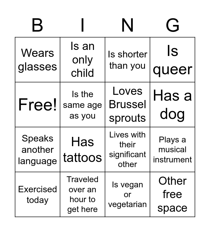 This bingo card has 16 words: Traveled over an hour to get here, Plays a musical instrument, Is shorter than you, Wears glasses, Speaks another language, Is an only child, Lives with their significant other, Is vegan or vegetarian, Free!, Is the same age as you, Exercised today, Is queer, Has tattoos, Has a dog, Loves Brussel sprouts and Other free space.