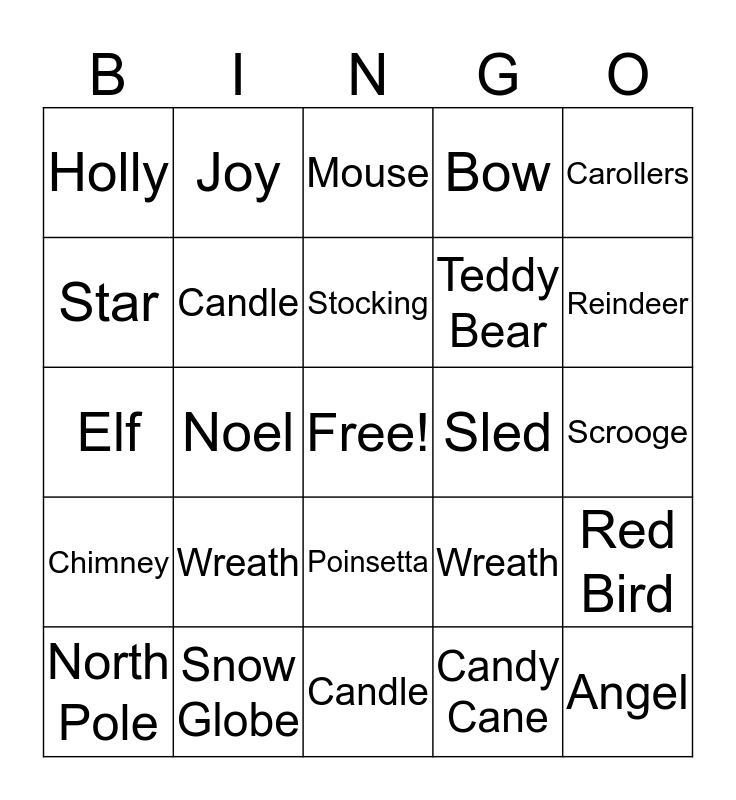 This bingo card has a free space and 37 words: Candy Cane, Snowman, Tree, Candle, Red Bird, Wreath, Stocking, Hot Chocolate, Carollers, Santa, Noel, Bow, Angel, Scrooge, Star, Chimney, Bell, Mouse, Poinsetta, Sled, Holly, Reindeer, North Pole, Candle, Cookies, Candy Cane, Joy, Snowflake, Ornament, Gift, Lights, Snow Globe, Elf, Cardinal, Wreath, Teddy Bear and Stocking.