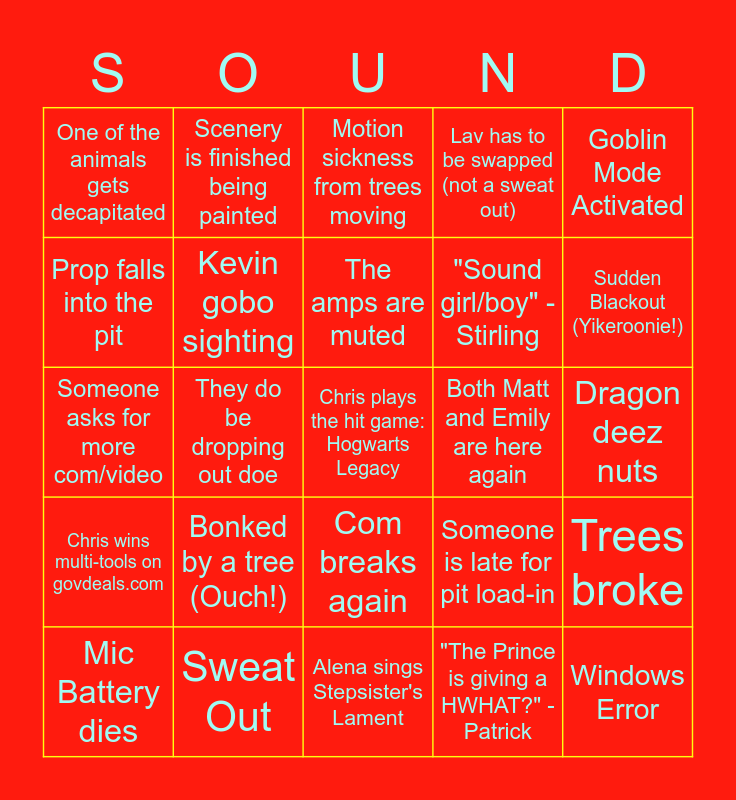 This bingo card has a free space and 24 words: Bonked by a tree (Ouch!), Sweat Out, The amps are muted, Mic Battery dies, Goblin Mode Activated, One of the animals gets decapitated, Prop falls into the pit, Scenery is finished being painted, Both Matt and Emily are here again, Com breaks again, "Sound girl/boy" - Stirling, Someone asks for more com/video, Someone is late for pit load-in, Trees broke, Kevin gobo sighting, "The Prince is giving a HWHAT?" -Patrick, Dragon deez nuts, Motion sickness from trees moving, Sudden Blackout (Yikeroonie!), They do be dropping out doe, Windows Error, Chris wins multi-tools on govdeals.com, Lav has to be swapped (not a sweat out) and Alena sings Stepsister's Lament.