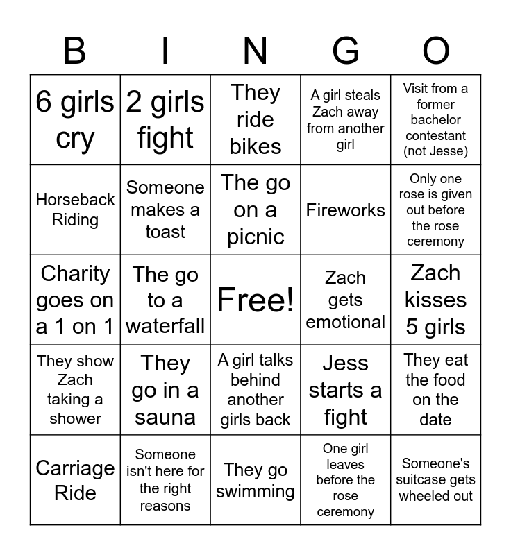 This bingo card has a free space and 24 words: They go in a sauna, Someone isn't here for the right reasons, The go on a picnic, Carriage Ride, Visit from a former bachelor contestant (not Jesse), 6 girls cry, Horseback Riding, 2 girls fight, Zach gets emotional, A girl talks behind another girls back, Fireworks, Charity goes on a 1 on 1, Jess starts a fight, They eat the food on the date, Someone makes a toast, One girl leaves before the rose ceremony, Zach kisses 5 girls, They ride bikes, Only one rose is given out before the rose ceremony, The go to a waterfall, Someone's suitcase gets wheeled out, They show Zach taking a shower, A girl steals Zach away from another girl and They go swimming.