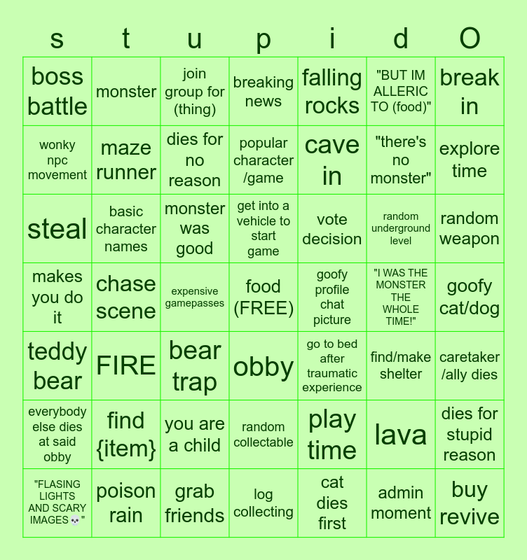 This bingo card has a free space and 48 words: play time, "there's no monster", log collecting, chase scene, monster was good, goofy cat/dog, monster, poison rain, "BUT IM ALLERIC TO (food)", obby, break in, breaking news, random underground level, vote decision, everybody else dies at said obby, "I WAS THE MONSTER THE WHOLE TIME!", wonky npc movement, explore time, lava, falling rocks, cave in, expensive gamepasses, boss battle, maze runner, dies for stupid reason, dies for no reason, random weapon, "FLASING LIGHTS AND SCARY IMAGES💀", get into a vehicle to start game, basic character names, admin moment, goofy profile chat picture, caretaker /ally dies, find {item}, makes you do it, go to bed after traumatic experience, find/make shelter, steal, bear trap, you are a child, teddy bear, buy revive, join group for (thing), grab friends, popular character /game, random collectable, FIRE and cat dies first.