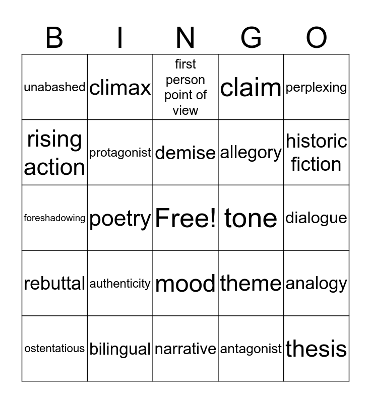 This bingo card has a free space and 24 words: authenticity, bilingual, demise, ostentatious, perplexing, unabashed, rising action, climax, tone, mood, allegory, foreshadowing, theme, analogy, protagonist, antagonist, dialogue, first person point of view, historic fiction, poetry, thesis, rebuttal, claim and narrative.