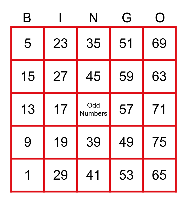 This bingo card has a free space and 24 words: 1, 19, 45, 53, 69, 5, 23, 35, 57, 71, 13, 27, 49, 75, 15, 29, 41, 51, 63, 9, 17, 39, 59 and 65.