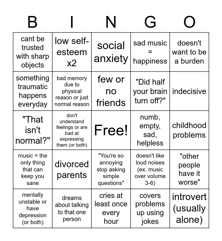 This bingo card has a free space and 24 words: mentally unstable or have depression (or both), divorced parents, few or no friends, covers problems up using jokes, doesn't want to be a burden, cant be trusted with sharp objects, low self-esteem x2, social anxiety, numb, empty, sad, helpless, childhood problems, "That isn't normal?", bad memory due to physical reason or just normal reason, doesn't like loud noises (ex. music over volume 3-6), "other people have it worse", something traumatic happens everyday, dreams about talking to that one person, cries at least once every hour, sad music = happiness, indecisive, music = the only thing that can keep you sane, don't understand feelings or are bad at expressing them (or both), "You're so annoying stop asking simple questions", "Did half your brain turn off?" and introvert (usually alone).
