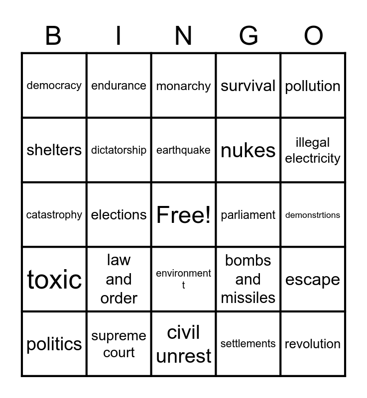 This bingo card has a free space and 29 words: politics, party, elections, vote, democracy, monarchy, dictatorship, law and order, parliament, supreme court, demonstrtions, revolution, civil unrest, settlements, illegal electricity, power plant, environment t, toxic, pollution, catastrophy, bombs and missiles, submarines, nukes, shelters, survival, endurance, escape, earthquake and overcome.