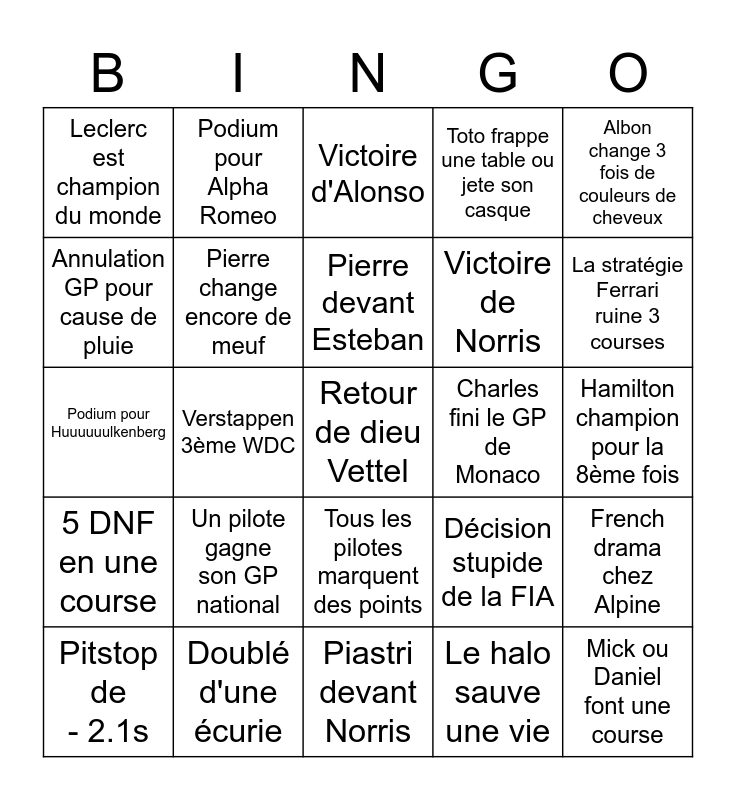 This bingo card has a free space and 24 words: Un pilote gagne son GP national, Doublé d'une écurie, Pierre devant Esteban, Pitstop de - 2.1s, Albon change 3 fois de couleurs de cheveux, Leclerc est champion du monde, Annulation GP pour cause de pluie, Podium pour Alpha Romeo, Charles fini le GP de Monaco, Tous les pilotes marquent des points, Victoire de Norris, Podium pour Huuuuuulkenberg, Décision stupide de la FIA, French drama chez Alpine, Pierre change encore de meuf, Le halo sauve une vie, Hamilton champion pour la 8ème fois, Victoire d'Alonso, La stratégie Ferrari ruine 3 courses, Verstappen 3ème WDC, Mick ou Daniel font une course, 5 DNF en une course, Toto frappe une table ou jete son casque and Piastri devant Norris.