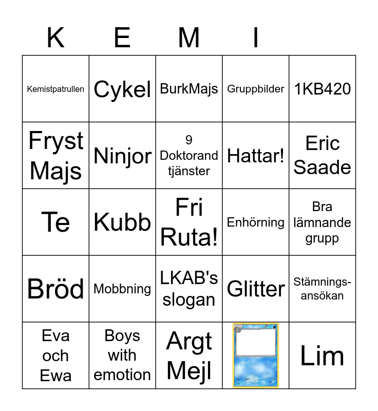 This bingo card has 1 images, a free space and 23 words: Mobbning, Boys with emotion, 9 Doktorand tjänster, Eva och Ewa, 1KB420, Kemistpatrullen, Fryst Majs, Cykel, Enhörning, LKAB's slogan, Hattar!, Te, Glitter, Stämnings-ansökan, Ninjor, Bra lämnande grupp, BurkMajs, Eric Saade, Kubb, Lim, Bröd, Gruppbilder and Argt Mejl.