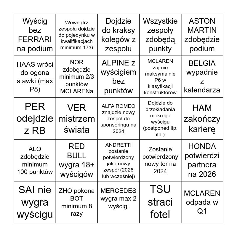 This bingo card has a free space and 24 words: RED BULL wygra 18+ wyścigów, ZHO pokona BOT minimum 8 razy, ALPINE z wyścigiem bez punktów, SAI nie wygra wyścigu, ASTON MARTIN zdobędzie podium, Wyścig bez FERRARI na podium, HAAS wróci do ogona stawki (max P8), Wewnątrz zespołu dojdzie do pojedynku w kwalifikacjach minimum 17:6, Dojdzie do przekładania mokrego wyścigu (postponed itp. itd.), ANDRETTI zostanie potwierdzony jako nowy zespół (2026 lub wcześniej), MCLAREN zajmie maksymalnie P6 w klasyfikacji konstruktorów, PER odejdzie z RB, Zostanie potwierdzony nowy tor na 2024, HONDA potwierdzi partnera na 2026, NOR zdobędzie minimum 2/3 punktów MCLARENa, TSU straci fotel, HAM zakończy karierę, Dojdzie do kraksy kolegów z zespołu, BELGIA wypadnie z kalendarza, VER mistrzem świata, MCLAREN odpada w Q1, ALO zdobędzie minimum 100 punktów, Wszystkie zespoły zdobędą punkty and MERCEDES wygra max 2 wyścigi.
