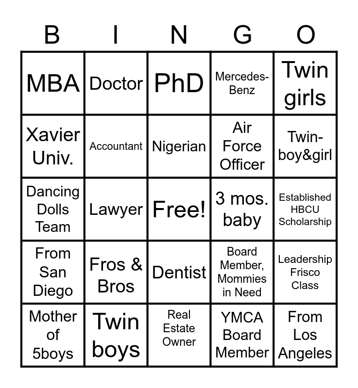 This bingo card has a free space and 24 words: Fros & Bros, Twin boys, Nigerian, Mother of 5boys, Twin girls, MBA, Xavier Univ., Doctor, 3 mos. baby, Dentist, Air Force Officer, Dancing Dolls Team, Board Member, Mommies in Need, Leadership Frisco Class, Accountant, YMCA Board Member, Established HBCU Scholarship, PhD, Twin-boy&girl, Lawyer, From Los Angeles, From San Diego, Mercedes-Benz and Real Estate Owner.