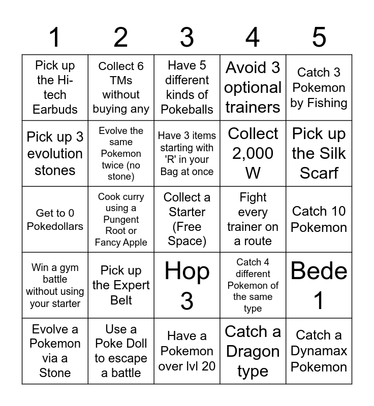 This bingo card has a free space and 24 words: Pick up the Expert Belt, Use a Poke Doll to escape a battle, Have 3 items starting with 'R' in your Bag at once, Evolve a Pokemon via a Stone, Catch 3 Pokemon by Fishing, Pick up the Hi-tech Earbuds, Pick up 3 evolution stones, Collect 6 TMs without buying any, Fight every trainer on a route, Hop 3, Collect 2,000 W, Get to 0 Pokedollars, Catch 4 different Pokemon of the same type, Bede 1, Evolve the same Pokemon twice (no stone), Catch a Dragon type, Catch 10 Pokemon, Have 5 different kinds of Pokeballs, Pick up the Silk Scarf, Cook curry using a Pungent Root or Fancy Apple, Catch a Dynamax Pokemon, Win a gym battle without using your starter, Avoid 3 optional trainers and Have a Pokemon over lvl 20.