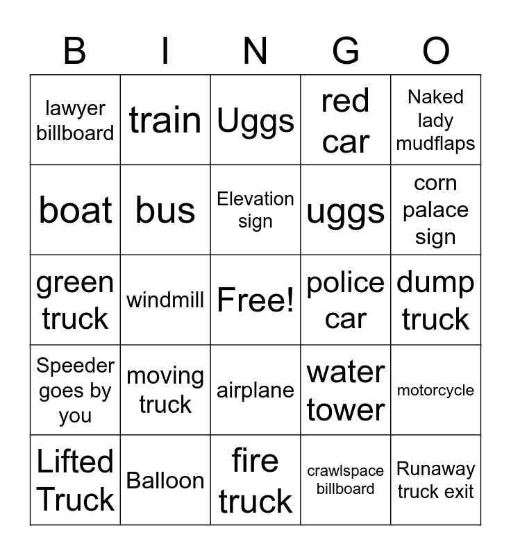 This bingo card has a free space and 24 words: moving truck, Balloon, Elevation sign, Lifted Truck, Naked lady mudflaps, lawyer billboard, boat, train, police car, airplane, uggs, green truck, water tower, motorcycle, bus, crawlspace billboard, dump truck, Uggs, corn palace sign, windmill, Runaway truck exit, Speeder goes by you, red car and fire truck.