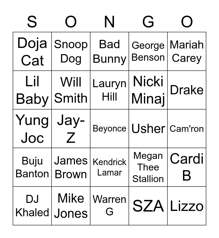 This bingo card has a free space and 49 words: Rihanna, Lizzo, Montel Jordan, Warren G, James Brown, Serani, Snoop Dog, Notorious BIG, Lil Baby, Adele, Will Smith, George Benson, Cardi B, Megan Thee Stallion, Prince, The Weeknd, Lauryn Hill, Usher, T Pain, Mariah Carey, Jay-Z, SZA, Doja Cat, Nicki Minaj, Jill Scott, Drake, DJ Khaled, Chris Brown, Kendrick Lamar, Buju Banton, Lil Jon, Ice Cube, The Jackson 5, Childish Gambino, Mike Jones, 50 Cent, 2Pac, Nas, Cam'ron, Outkast, DMX, Ludacris, Missy Elliott, Wizkid, Yung Joc, Bad Bunny, Dionne Warwick, Aretha Franklin and India Arie.