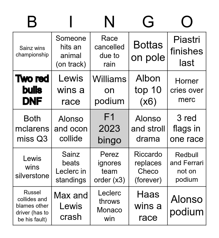 This bingo card has a free space and 24 words: Sainz beats Leclerc in standings, Max and Lewis crash, Williams on podium, Russel collides and blames other driver (has to be his fault), Piastri finishes last, Sainz wins championship, Two red bulls DNF, Someone hits an animal (on track), Alonso and stroll drama, Perez ignores team order (x3), Albon top 10 (x6), Both mclarens miss Q3, Riccardo replaces Checo (forever), Redbull and Ferrari not on podium, Lewis wins a race, Haas wins a race, 3 red flags in one race, Race cancelled due to rain, Horner cries over merc, Alonso and ocon collide, Alonso podium, Lewis wins silverstone, Bottas on pole and Leclerc throws Monaco win.