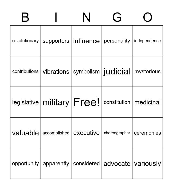 This bingo card has a free space and 24 words: accomplished, apparently, symbolism, opportunity, independence, revolutionary, contributions, supporters, constitution, executive, judicial, legislative, choreographer, ceremonies, vibrations, advocate, medicinal, influence, mysterious, military, variously, valuable, personality and considered.