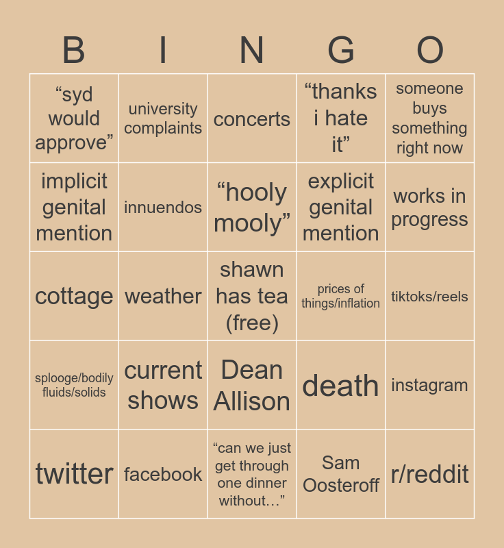 This bingo card has a free space and 36 words: pinterest, mouthfeel, “that’s what she said”, innuendos, death, splooge/bodily fluids/solids, “hooly mooly”, drugs, someone buys something right now, medical issues, weather, “thanks i hate it”, scott’s beer, prices of things/inflation, works in progress, “syd would approve”, news, current shows, r/reddit, concerts, tiktoks/reels, instagram, facebook, twitter, “can we just get through one dinner without…”, university complaints, cottage, “fun fact”, explicit genital mention, implicit genital mention, call back from couch talk, gossip, Sam Oosteroff, Dean Allison, Justin Trudeau and family history.