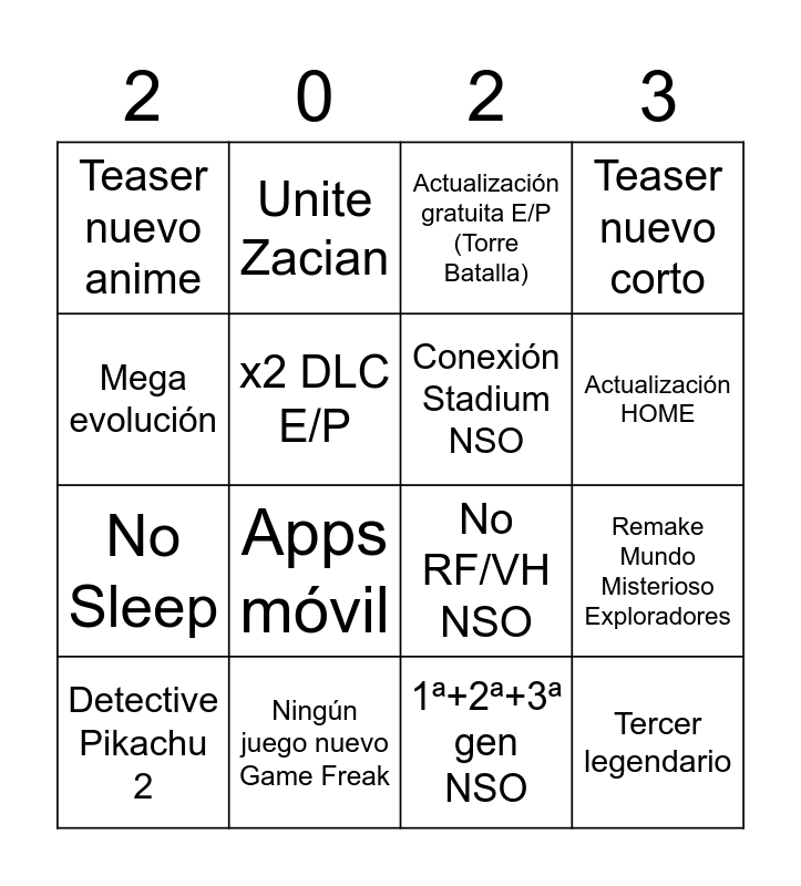 This bingo card has 16 words: Ningún juego nuevo Game Freak, Remake Mundo Misterioso Exploradores, Actualización gratuita E/P (Torre Batalla), Teaser nuevo anime, No Sleep, Unite Zacian, No RF/VH NSO, 1ª+2ª+3ª gen NSO, Mega evolución, x2 DLC E/P, Detective Pikachu 2, Teaser nuevo corto, Apps móvil, Actualización HOME, Conexión Stadium NSO and Tercer legendario.