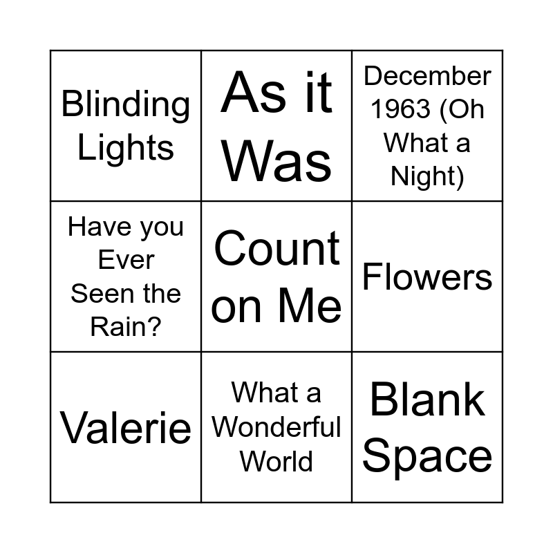 This bingo card has a free space and 8 words: Flowers, December 1963 (Oh What a Night), As it Was, Valerie, Blinding Lights, Blank Space, Have you Ever Seen the Rain? and What a Wonderful World.