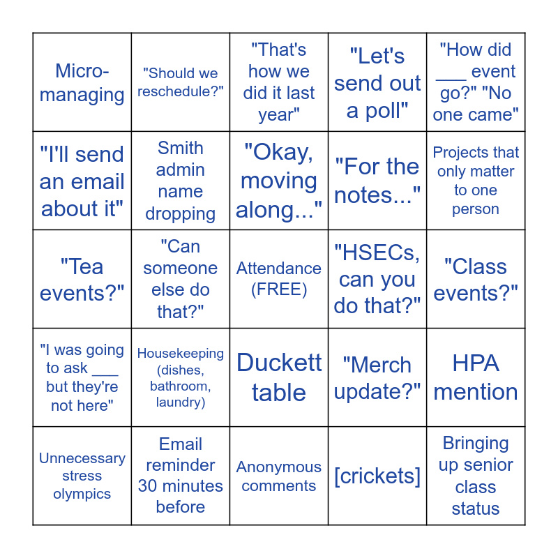 This bingo card has a free space and 24 words: Housekeeping (dishes, bathroom, laundry), Email reminder 30 minutes before, "Okay, moving along...", Unnecessary stress olympics, "How did ___ event go?" "No one came", Micro-managing, "I'll send an email about it", "Should we reschedule?", "HSECs, can you do that?", Duckett table, "For the notes...", "Tea events?", "Merch update?", HPA mention, Smith admin name dropping, [crickets], "Class events?", "That's how we did it last year", Projects that only matter to one person, "Can someone else do that?", Bringing up senior class status, "I was going to ask ___ but they're not here", "Let's send out a poll" and Anonymous comments.