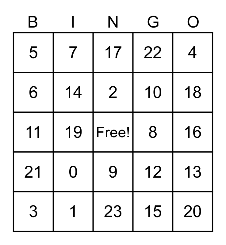 This bingo card has a free space and 24 words: 0, 1, 2, 3, 4, 5, 6, 7, 8, 9, 10, 11, 12, 13, 14, 15, 16, 17, 18, 19, 20, 21, 22 and 23.