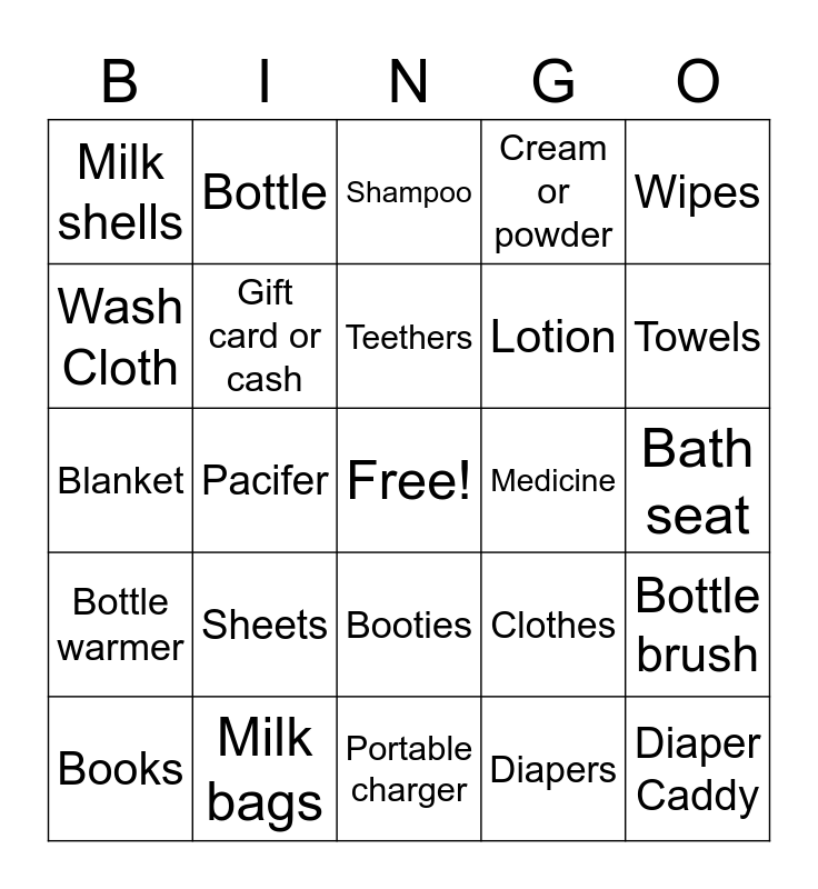 This bingo card has a free space and 24 words: Sheets, Milk bags, Teethers, Books, Wipes, Milk shells, Wash Cloth, Bottle, Medicine, Booties, Lotion, Blanket, Clothes, Bottle brush, Gift card or cash, Diapers, Bath seat, Shampoo, Towels, Pacifer, Diaper Caddy, Bottle warmer, Cream or powder and Portable charger.