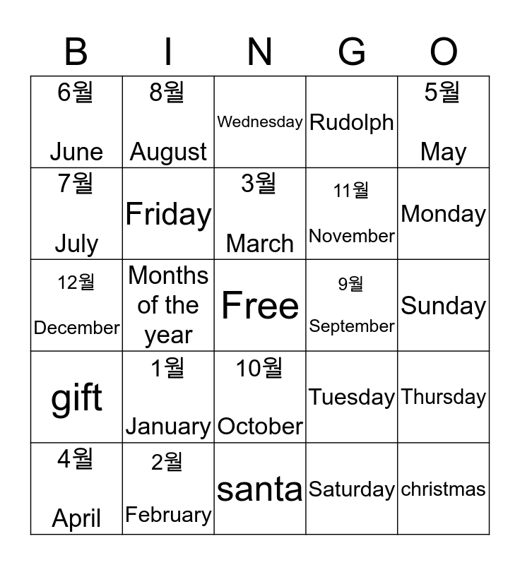 This bingo card has a free space and 24 words: 1월 January, 2월 February, 3월 March, 4월 April, 5월 May, 6월 June, 7월 July, 8월 August, 9월 September, 10월 October, 11월 November, 12월 December, Tuesday, Thursday, Friday, Saturday, Sunday, Wednesday, Monday, Months of the year, christmas, gift, Rudolph and santa.