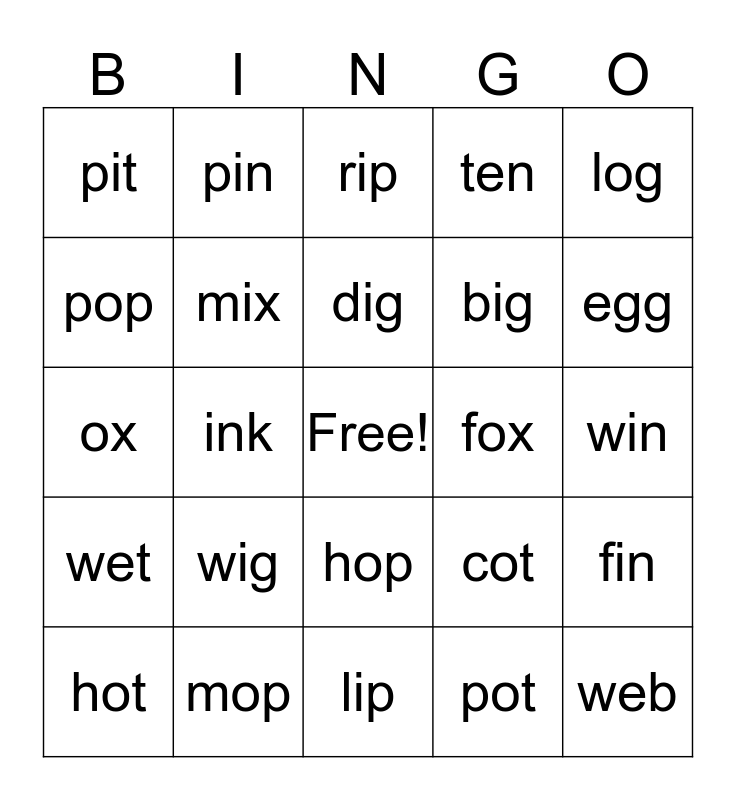 This bingo card has a free space and 24 words: wig, mop, dig, hot, log, pit, pop, pin, fox, hop, big, ox, cot, fin, mix, pot, win, rip, egg, ink, web, wet, ten and lip.