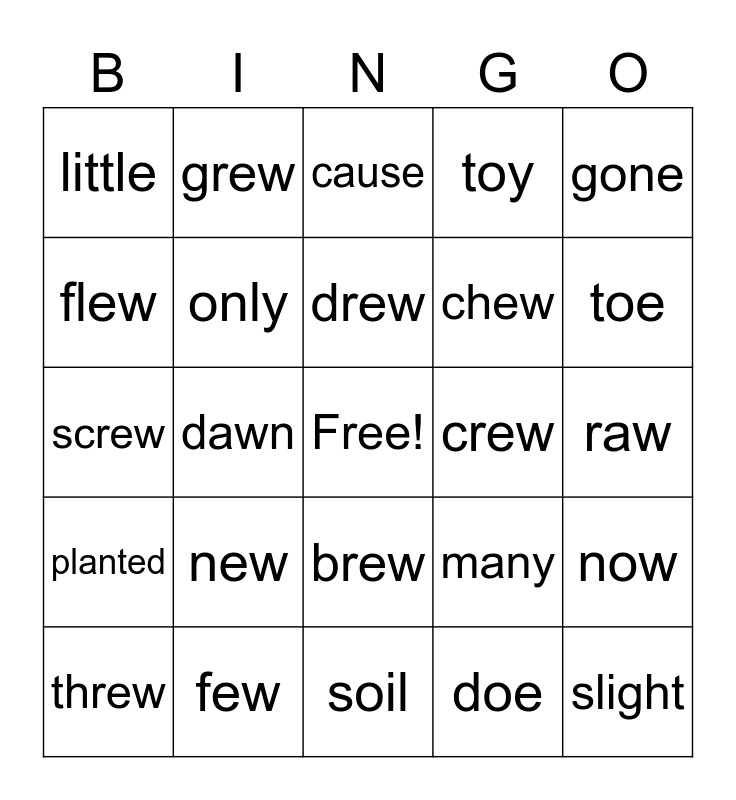 This bingo card has a free space and 24 words: new, few, drew, threw, gone, little, flew, grew, crew, brew, chew, screw, many, now, only, doe, raw, cause, toe, dawn, slight, planted, toy and soil.