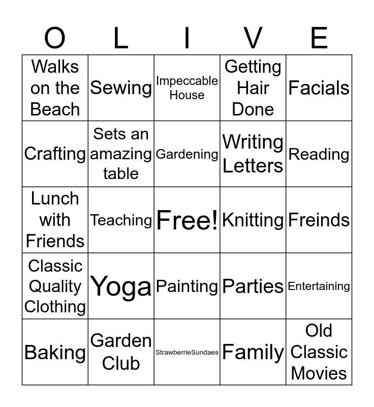 This bingo card has a free space and 24 words: Yoga, Garden Club, Gardening, Baking, Facials, Walks on the Beach, Crafting, Sewing, Knitting, Painting, Writing Letters, Lunch with Friends, Parties, Entertaining, Sets an amazing table, Family, Freinds, Impeccable House, Reading, Teaching, Old Classic Movies, Classic Quality Clothing, Getting Hair Done and StrawberrieSundaes.