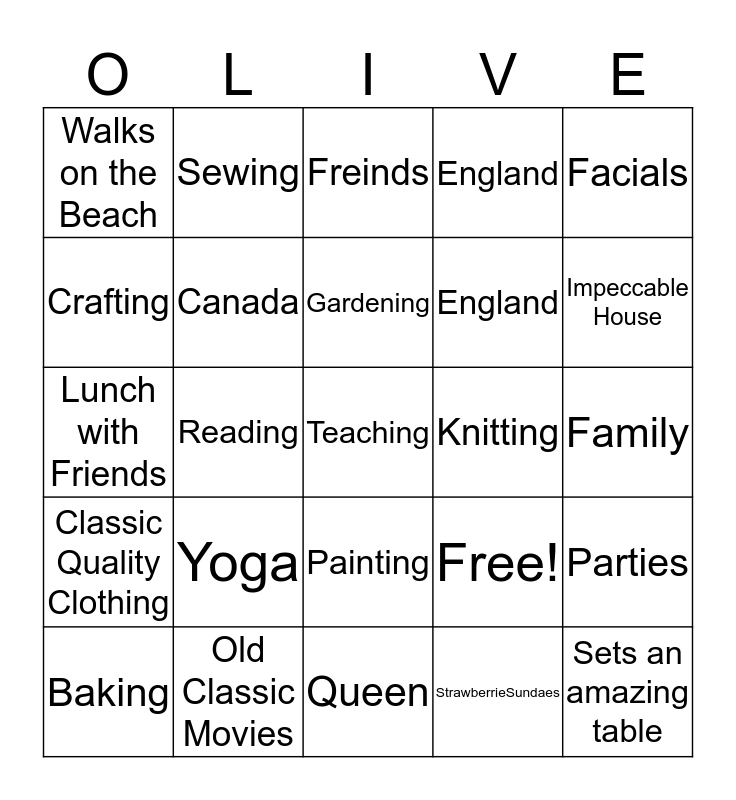 This bingo card has 25 words: Yoga, Queen, Gardening, Baking, Facials, Walks on the Beach, Crafting, Sewing, Knitting, Painting, England, Lunch with Friends, Free!, Parties, Canada, Sets an amazing table, Family, Freinds, Impeccable House, Reading, Teaching, Old Classic Movies, Classic Quality Clothing, England and StrawberrieSundaes.