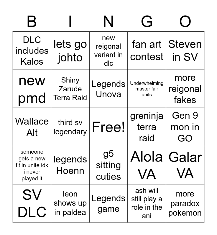 This bingo card has a free space and 25 words: legends Hoenn, Legends game, Legends Unova, SV DLC, Steven in SV, DLC includes Kalos, new pmd, lets go johto, greninja terra raid, g5 sitting cuties, Underwhelming master fair units, Wallace Alt, Alola VA, Galar VA, Shiny Zarude Terra Raid, Pokemon sleep, Gen 9 mon in GO, new reigonal variant in dlc, more reigonal fakes, third sv legendary, more paradox pokemon, leon shows up in paldea, someone gets a new fit in unite idk i never played it, fan art contest and ash will still play a role in the ani.