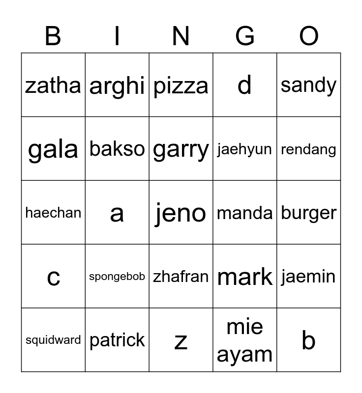 This bingo card has a free space and 24 words: spongebob, patrick, garry, squidward, sandy, zatha, gala, arghi, manda, zhafran, jaehyun, haechan, mark, jaemin, bakso, mie ayam, burger, pizza, rendang, a, b, c, d and z.