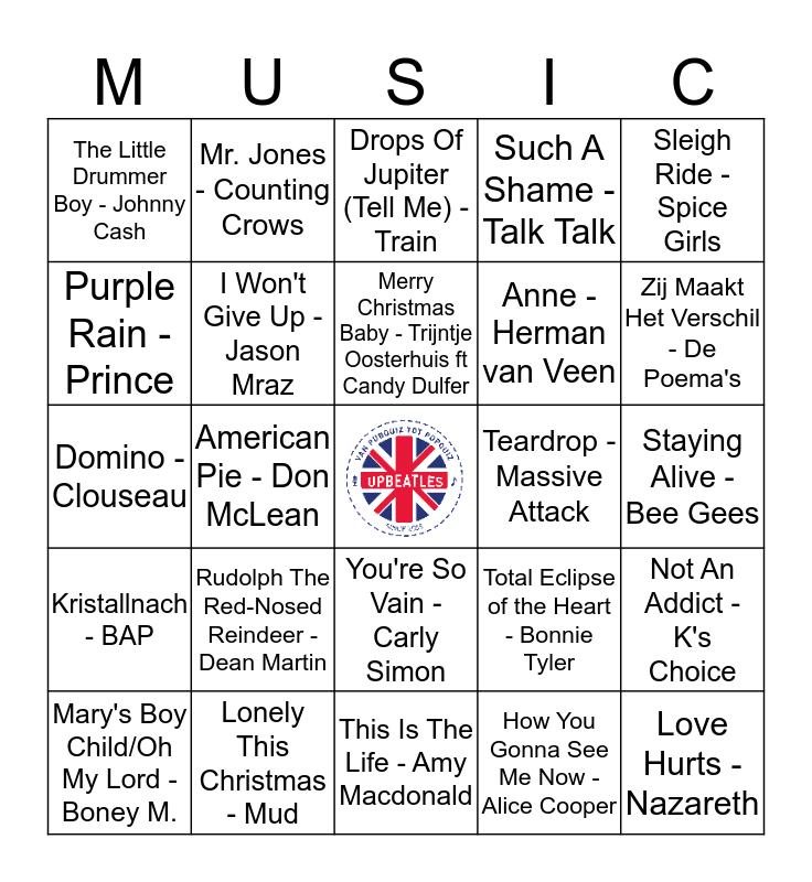 This bingo card has a free space and 24 words: Rudolph The Red-Nosed Reindeer - Dean Martin, Lonely This Christmas - Mud, Merry Christmas Baby - Trijntje Oosterhuis ft Candy Dulfer, Mary's Boy Child/Oh My Lord - Boney M., Sleigh Ride - Spice Girls, The Little Drummer Boy - Johnny Cash, Purple Rain - Prince, Mr. Jones - Counting Crows, Teardrop - Massive Attack, You're So Vain - Carly Simon, Anne - Herman van Veen, Domino - Clouseau, Total Eclipse of the Heart - Bonnie Tyler, Not An Addict - K's Choice, I Won't Give Up - Jason Mraz, How You Gonna See Me Now - Alice Cooper, Staying Alive - Bee Gees, Drops Of Jupiter (Tell Me) - Train, Zij Maakt Het Verschil - De Poema's, American Pie - Don McLean, Love Hurts - Nazareth, Kristallnach - BAP, Such A Shame - Talk Talk and This Is The Life - Amy Macdonald.