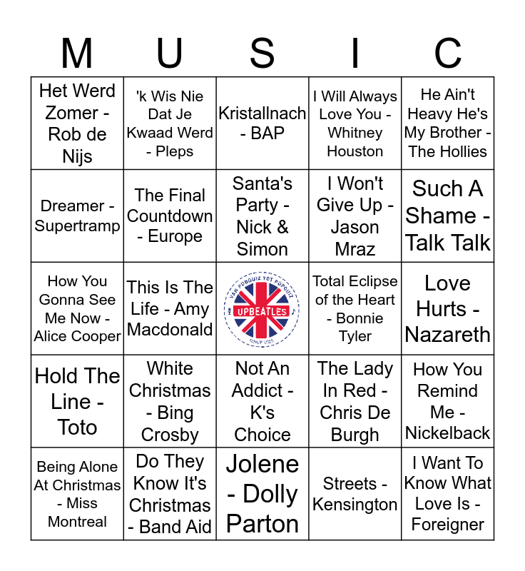 This bingo card has a free space and 24 words: White Christmas - Bing Crosby, Do They Know It's Christmas - Band Aid, Santa's Party - Nick & Simon, Being Alone At Christmas - Miss Montreal, He Ain't Heavy He's My Brother - The Hollies, Het Werd Zomer - Rob de Nijs, Dreamer - Supertramp, 'k Wis Nie Dat Je Kwaad Werd - Pleps, Total Eclipse of the Heart - Bonnie Tyler, Not An Addict - K's Choice, I Won't Give Up - Jason Mraz, How You Gonna See Me Now - Alice Cooper, The Lady In Red - Chris De Burgh, How You Remind Me - Nickelback, The Final Countdown - Europe, Streets - Kensington, Love Hurts - Nazareth, Kristallnach - BAP, Such A Shame - Talk Talk, This Is The Life - Amy Macdonald, I Want To Know What Love Is - Foreigner, Hold The Line - Toto, I Will Always Love You - Whitney Houston and Jolene - Dolly Parton.