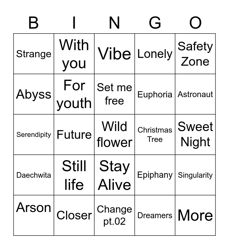 This bingo card has a free space and 24 words: Still life, Closer, Set me free, Arson, Safety Zone, Strange, Abyss, With you, Christmas Tree, Stay Alive, Euphoria, Serendipity, Epiphany, Singularity, For youth, Dreamers, Sweet Night, Vibe, Astronaut, Future, More, Daechwita, Lonely and Change pt.02.