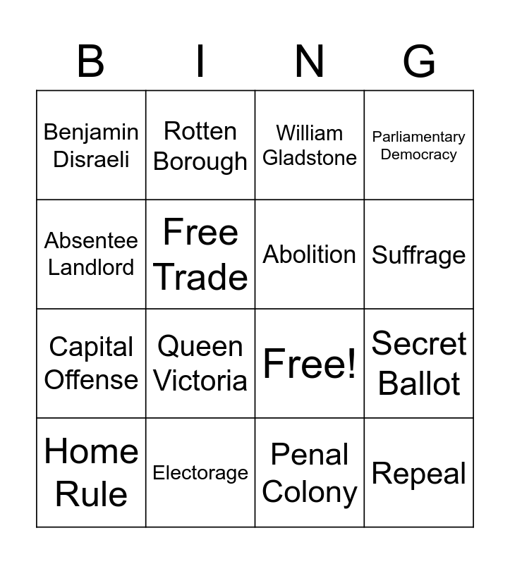 This bingo card has 16 words: Electorage, Secret Ballot, William Gladstone, Benjamin Disraeli, Capital Offense, Rotten Borough, Free!, Penal Colony, Absentee Landlord, Free Trade, Home Rule, Parliamentary Democracy, Queen Victoria, Suffrage, Abolition and Repeal.