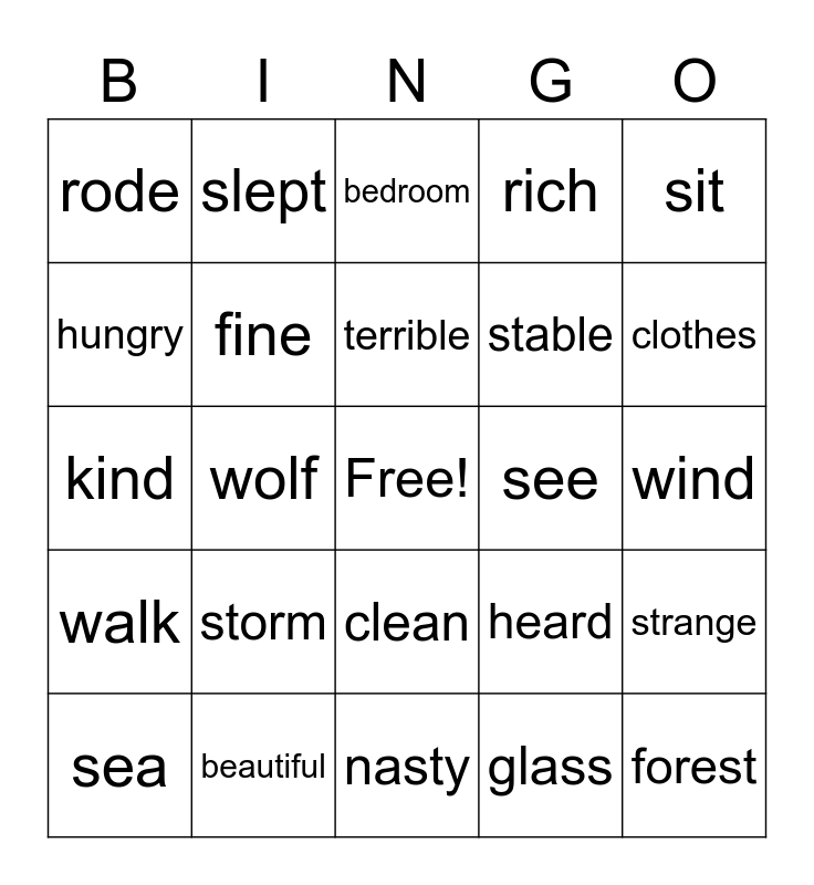 This bingo card has a free space and 28 words: strange, horse, stable, glass, hungry, bedroom, slept, walk, see, sea, kind, rich, beautiful, nasty, clothes, books, storm, fine, terrible, clean, rode, rose, forest, wolf, wind, heard, sit and silver.