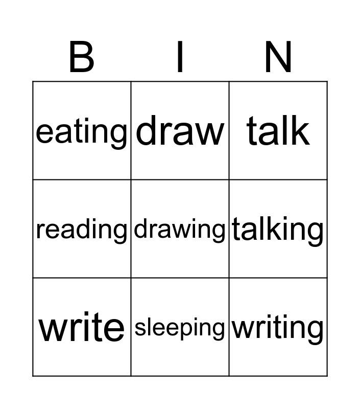 This bingo card has 9 words: write, talk, draw, reading, eating, talking, drawing, writing and sleeping.