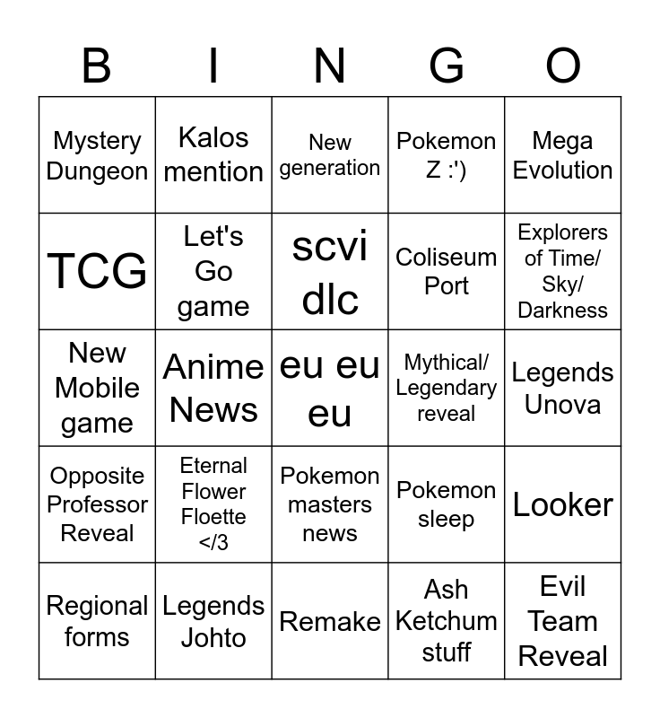 This bingo card has a free space and 24 words: Eternal Flower Floette </3, Legends Johto, scvi dlc, Regional forms, Mega Evolution, Mystery Dungeon, TCG, Kalos mention, Mythical/ Legendary reveal, Pokemon masters news, Coliseum Port, New Mobile game, Pokemon sleep, Looker, Let's Go game, Ash Ketchum stuff, Legends Unova, New generation, Explorers of Time/ Sky/ Darkness, Anime News, Evil Team Reveal, Opposite Professor Reveal, Pokemon Z :') and Remake.