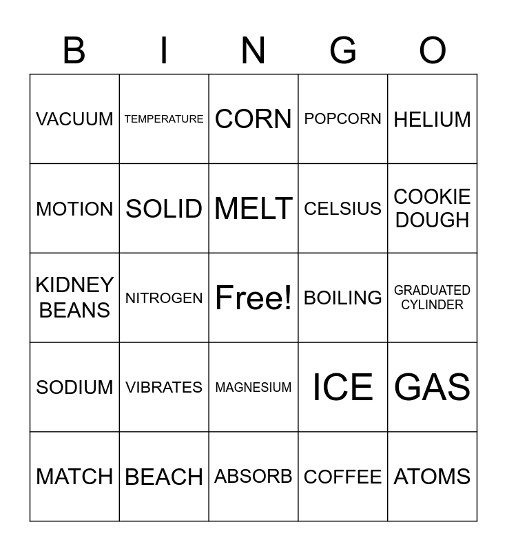 This bingo card has a free space and 52 words: THERMAL ENERGY, ATOMS, MATTER, ABSORB, VIBRATES, POTATO, TEMPERATURE, KINETIC, MOTION, SPEED, SOLID, LIQUID, GAS, ICE, HOT PLATE, FLASK, MELT, BOILING, CONDENSATION, HELIUM, NITROGEN, COFFEE, VACUUM, CELSIUS, CHICKPEAS, JALAPENOS, ENVIRONMENT, TRANSFER, COOKIE DOUGH, CHOCOLATE CHIPS, MICROWAVE, POPCORN, ICE POPS, SNOW, TOMATO, CORN, BEACH, MOUNTAIN, POTENTIAL, BALANCE, PIPETTE, GRADUATED CYLINDER, SODIUM, CALCIUM, MAGNESIUM, TEA, FARENHEIT, KIDNEY BEANS, CAKE, SPRINKLES, MATCH and BEAKER.