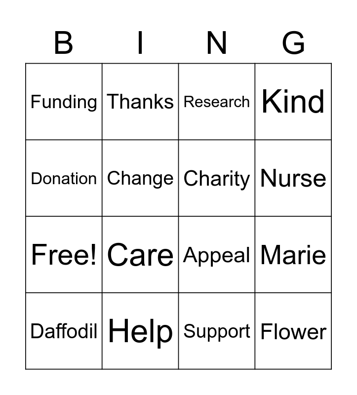 This bingo card has 20 words: Daffodil, Yellow, Research, Marie, Curie, Care, Support, Kind, Free!, Thanks, Appeal, Nurse, Funding, Help, Charity, Awareness, Donation, Change, Badge and Flower.