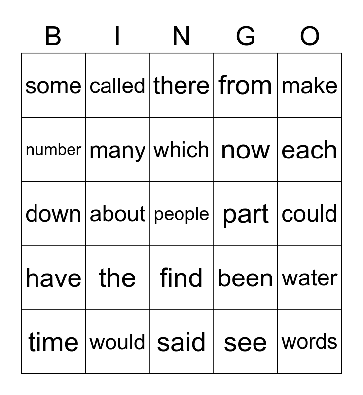 This bingo card has a free space and 24 words: the, would, which, time, make, some, number, called, part, find, now, down, been, water, many, see, could, there, each, about, words, have, from and said.