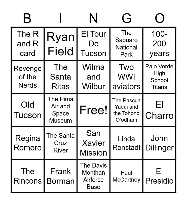 This bingo card has a free space and 39 words: Caleb Hymson, 3 bucks, Tucson High, The Santa Ritas, The Rincons, San Xavier Mission, Wilma and Wilbur, Mount Lemmon, 100-200 years, Regina Romero, The Pima Air and Space Museum, The Saguaro National Park, El Presidio, El Charro, The Pascua Yaqui and the Tohono O’odham, The Santa Cruz River, A-Mountain, The R and R card, Ms. Meneguin, Linda Ronstadt, Revenge of the Nerds, The Davis Monthan Airforce Base, Two WWI aviators, Palo Verde High School Titans, 23 credits, Catalina High School, Cleveland Indians, 1997, Jesse Owens, Ryan Field, The Confederate Flag, The Softball Team, El Tour De Tucson, Frank Borman, Paul McCartney, Joe Bonanno, John Dillinger, Old Tucson and La Llorona.