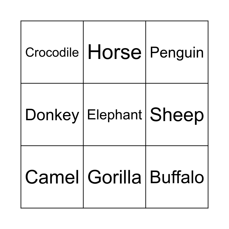 This bingo card has 9 words: Camel, Elephant, Penguin, Crocodile, Horse, Sheep, Donkey, Gorilla and Buffalo.