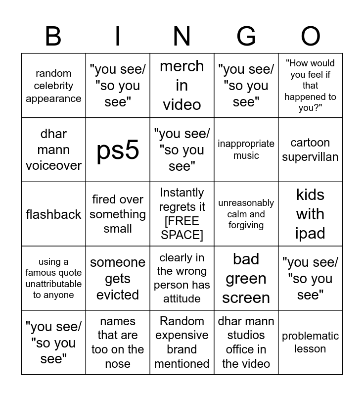 This bingo card has a free space and 29 words: "you see/ "so you see", child with unrealistic emotional maturity, fired over something small, what happens in the dark always comes to light, random celebrity appearance, merch in video, ps5, someone gets evicted, unreasonably calm and forgiving, names that are too on the nose, kids with ipad, problematic lesson, Random expensive brand mentioned, dhar mann studios office in the video, cartoon supervillan, parking lot confrontation, clearly in the wrong person has attitude, using a famous quote unattributable to anyone, "How would you feel if that happened to you?", flashback, bad green screen, bad props, inappropriate music, dhar mann voiceover, "you see/ "so you see", "you see/ "so you see", "you see/ "so you see", "you see/ "so you see" and "you see/ "so you see".