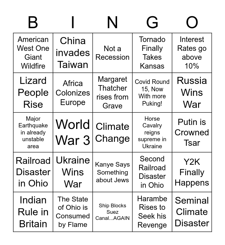 This bingo card has a free space and 24 words: Ukraine Wins War, The State of Ohio is Consumed by Flame, Margaret Thatcher rises from Grave, Indian Rule in Britain, Interest Rates go above 10%, American West One Giant Wildfire, Lizard People Rise, China invades Taiwan, Horse Cavalry reigns supreme in Ukraine, Kanye Says Something about Jews, Covid Round 15, Now With more Puking!, Major Earthquake in already unstable area, Second Railroad Disaster in Ohio, Y2K Finally Happens, Africa Colonizes Europe, Harambe Rises to Seek his Revenge, Putin is Crowned Tsar, Not a Recession, Russia Wins War, World War 3, Seminal Climate Disaster, Railroad Disaster in Ohio, Tornado Finally Takes Kansas and Ship Blocks Suez Canal...AGAIN.