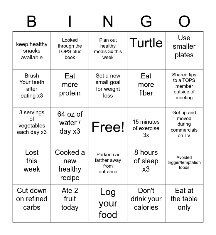 This bingo card has a free space and 24 words: Cooked a new healthy recipe, Ate 2 fruit today, Set a new small goal for weight loss, Cut down on refined carbs, Use smaller plates, keep healthy snacks available, Brush Your teeth after eating x3, Looked through the TOPS blue book, 15 minutes of exercise 3x, Parked car farther away from entrance, Eat more fiber, 3 servings of vegetables each day x3, 8 hours of sleep x3, Avoided trigger/temptation foods, Eat more protein, Don't drink your calories, Got up and moved during commercials on TV, Plan out healthy meals 3x this week, Shared tips to a TOPS member outside of meeting, 64 oz of water / day x3, Eat at the table only, Lost this week, Turtle and Log your food.