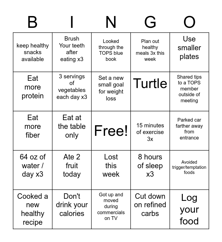 This bingo card has a free space and 24 words: Cooked a new healthy recipe, Ate 2 fruit today, Set a new small goal for weight loss, Cut down on refined carbs, Use smaller plates, keep healthy snacks available, Brush Your teeth after eating x3, Looked through the TOPS blue book, 15 minutes of exercise 3x, Parked car farther away from entrance, Eat more fiber, 3 servings of vegetables each day x3, 8 hours of sleep x3, Avoided trigger/temptation foods, Eat more protein, Don't drink your calories, Got up and moved during commercials on TV, Plan out healthy meals 3x this week, Shared tips to a TOPS member outside of meeting, 64 oz of water / day x3, Eat at the table only, Lost this week, Turtle and Log your food.