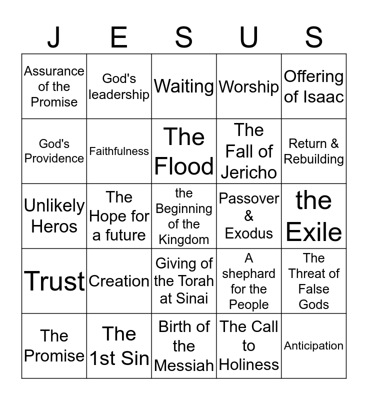 This bingo card has a free space and 24 words: Creation, The 1st Sin, The Flood, The Promise, Offering of Isaac, Assurance of the Promise, God's Providence, God's leadership, Passover & Exodus, Giving of the Torah at Sinai, The Fall of Jericho, Unlikely Heros, A shephard for the People, The Threat of False Gods, Faithfulness, The Call to Holiness, the Exile, Waiting, Return & Rebuilding, The Hope for a future, Anticipation, Trust, Worship and Birth of the Messiah.