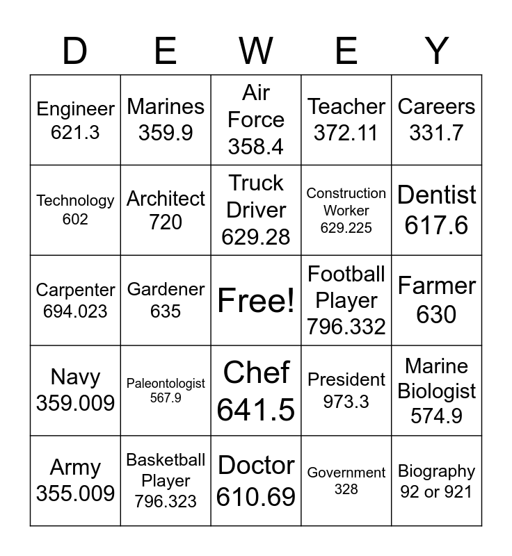 This bingo card has a free space and 28 words: Marine Biologist 574.9, Astronaut 629.45, Construction Worker 629.225, Government 328, Technology 602, Air Force 358.4, Marines 359.9, Navy 359.009, Football Player 796.332, Army 355.009, Carpenter 694.023, Teacher 372.11, Basketball Player 796.323, Doctor 610.69, Dentist 617.6, Artist 759.13, Paleontologist 567.9, Architect 720, Truck Driver 629.28, Chef 641.5, Engineer 621.3, Firefighter 628.9, Biography 92 or 921, Gardener 635, Farmer 630, President 973.3, Careers 331.7 and Movie Producer 791.43.